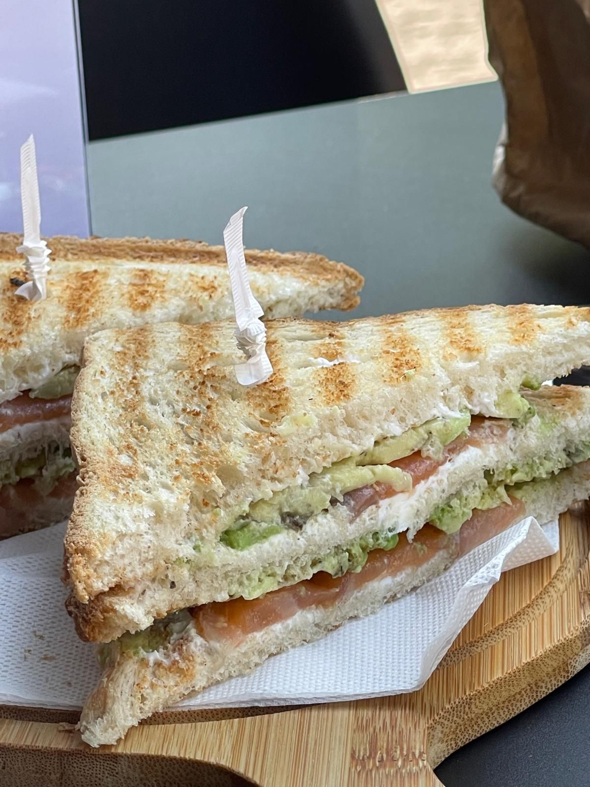 (pane sandwich , crema di formaggio fresco , avocado, salmone affumicato olio limone sale e pepe)