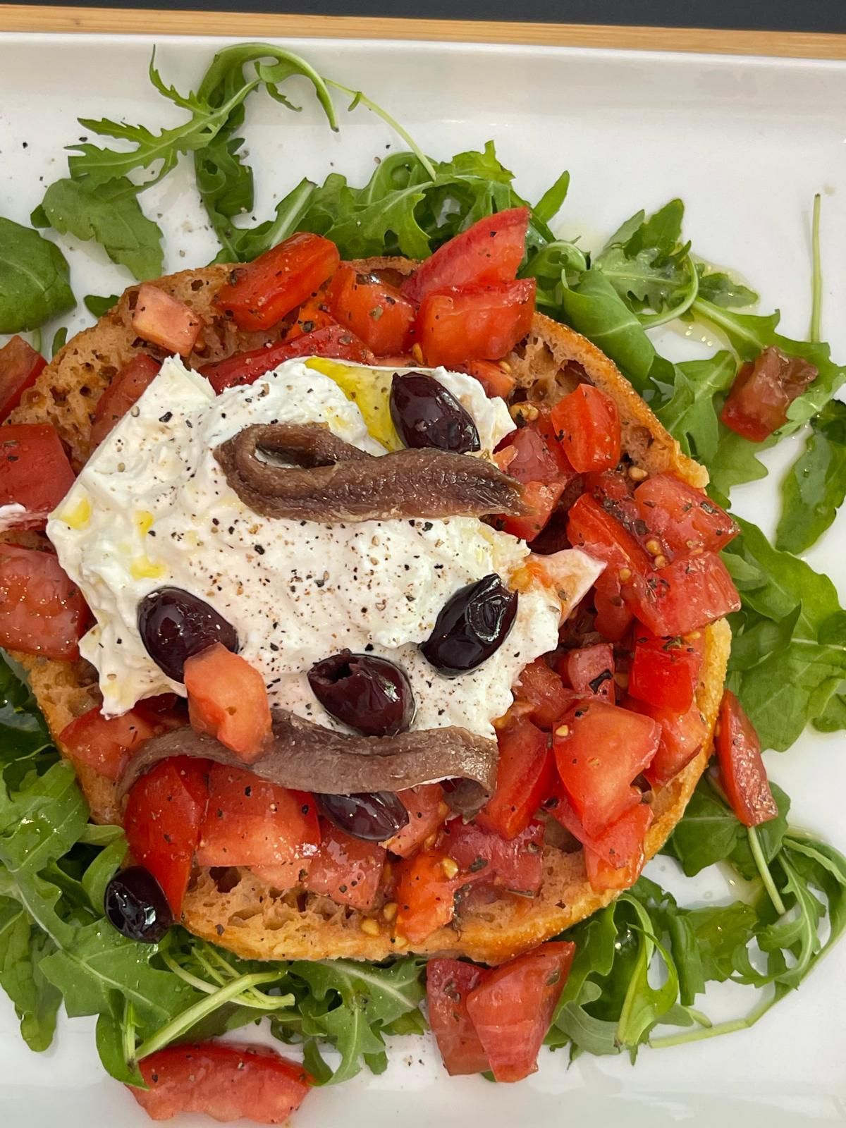 (frisella artigianale di grano duro, pomodori San Marzano con olio , sale, pepe e aceto basaltico , acciughe e basico fresco)